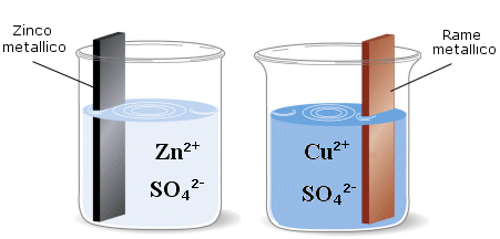 Nella pila Daniell una barretta di zinco metallico viene immersa in una soluzione di solfato di zinco che, dissociandosi completamente, fornisce gli ioni Zn2+, mentre una barretta di rame metallico viene immersa in una soluzione di solfato rameico che fornisce gli ioni Cu2+.