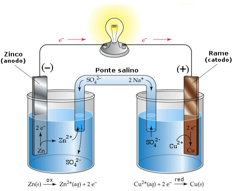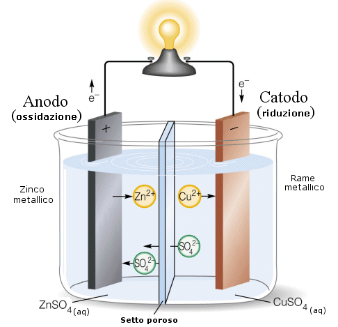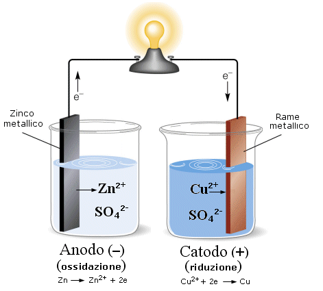 Finché le due semicelle rimangono separate non si osserva naturalmente alcuna reazione. Ma se colleghiamo con un filo metallico i due elettrodi, lo Zinco, che ha una maggiore tendenza ad ossidarsi rispetto al Rame, perde elettroni. Gli elettroni, passando attraverso il conduttore metallico, vengono attirati dagli ioni rameici che li acquistano e si riducono.
