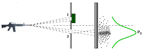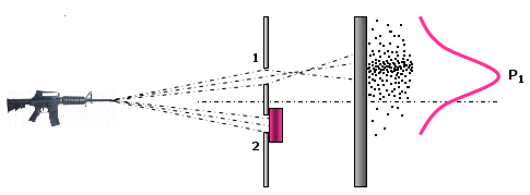 Inizialmente apriamo solo la prima finestra. Scopriamo che i proiettili si distribuiscono in modo caratteristico, che viene tipicamente descritto da una distribuzione di frequenza detta gaussiana (o "curva a campana" o anche "curva degli errori" perché descrive la distribuzione degli errori ed evidenzia come gli errori molto piccoli e molto grandi sono via via meno frequenti). Se i lanci effettuati sono sufficientemente numerosi la curva di frequenza diventa una buona misura della probabilità che possiede ciascun punto dello schermo di essere colpito.