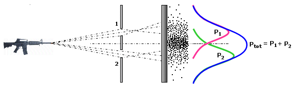 Aprendo infine entrambe le finestre scopriremo che nei punti in cui le due curve di probabilità si sovrappongono, i proiettili arrivano con maggior frequenza. Si può facilmente verificare che ora la probabilità che ciascun punto dello schermo venga colpito è esattamente la somma delle due curve di probabilità singole. Le probabilità non quantistiche di eventi indipendenti si sommano. Per i proiettili vale dunque Ptot = P1 + P2