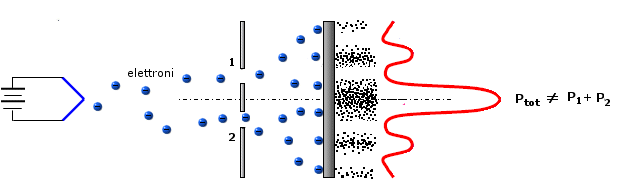 Si dimostra quindi facilmente che nel caso degli elettroni, dove il comportamento ondulatorio non può essere trascurato, la probabilità che essi colpiscano lo schermo con due fenditure aperte non può essere ottenuta come semplice somma delle probabilità che essi colpiscano lo schermo con le fenditure alternativamente aperte. Il quadrato di una somma è infatti diverso dalla somma dei quadrati