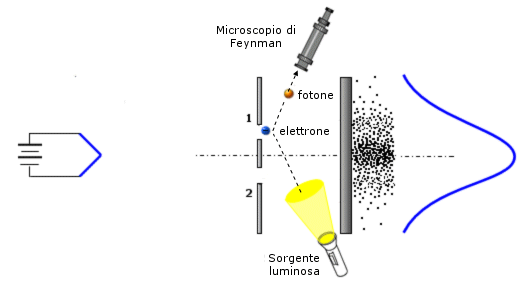 È possibile tentare di rispondere a questa domanda cercando di osservare il passaggio dei singoli elettroni attraverso le fenditure. Collochiamo allora un rivelatore alle fenditure che ci informi del passaggio del singolo elettrone. Ad esempio potremo osservare l'elettrone, illuminandolo con un fotone (microscopio di Feynman). Saremo così in grado di sapere da quale fenditura è passato l'elettrone.