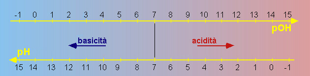 Fig.23.3 Scale di pH e di pOH, cioè di acidità e basicità. pH = pOH = 7 corrisponde alla neutralità. La somma pH+pOH = 14 in ogni soluzione acquosa a 25°C. Da notare che le scale non iniziano da 0 e non terminano a 14: questi valori corrispondono semplicemente a soluzioni che contengano 1 sola mole/litro di acido o base forte; è facile ottenere soluzioni acide con pH<0 (una soluzione che contenga 10 moli/litro di HCl ha infatti pH = -1 e pOH = 15).