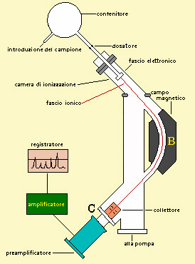 Fig.3.5 Schematizzazione di uno spettrometro di massa magnetico In alto un contenitore che funziona da serbatoio per il campione; attraverso il dosatore di flusso, piccolissime quantità del campione (dell'ordine di grandezza del milligrammo) entrano nella camera di ionizzazione, in cui un fascio elettronico bombarda le molecole M (o gli atomi) del campione; parte di esse vengono trasformate in ioni positivi M+, con perdita di un elettrone; gli elettroni in eccesso o eventuali M- che si siano eventualmente formati, vengono bloccati su una parete della camera mantenuta a potenziale positivo; i cationi M+ vengono invece accelerati mediante una serie di griglie collimanti a potenziali sempre più negativi, creando così un fascio ionico che entra a sua volta in un campo magnetico controllabile B; poiché i cationi hanno carica (e) eguale, ma possono avere massa (m) diversa, compiranno, sotto l'effetto del campo magnetico, traiettorie a raggio di curvatura diverso in funzione della loro massa; solo i cationi con massa compresa entro un intervallo ristretto potranno percorrere, senza urtare le pareti, tutto il cammino; quelli che riescono a passare, vengono collimati su una piastra collettrice provocando un segnale, che viene preamplificato, amplificato, rielaborato e quindi registrato. Variando perciò il campo, sarà possibile far passare progressivamente tutti i possibili cationi con massa diversa; lo spettro rappresenta perciò gli impulsi di tutti cationi secondo una relazione che lega e/m in funzione del raggio di curvatura R e del campo magnetico H. Tutte le particelle non cariche vengono estratte dal sistema di misura mediante una pompa a vuoto diffusiva, che permette di raggiungere pressioni dell'ordine di 10-5-10-6mm Hg; questa è una condizione essenziale per evitare urti con i cationi. |
