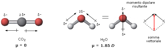 Così, ad esempio, se confrontiamo la polarità dell'anidride carbonica e dell'acqua, troveremo che mentre l'anidride carbonica è apolare, l'acqua è polare. L'anidride carbonica è infatti una molecola lineare ed il momento di dipolo dei suoi due legami risulta essere uguale e contrario, per cui il momento risultante è nullo.