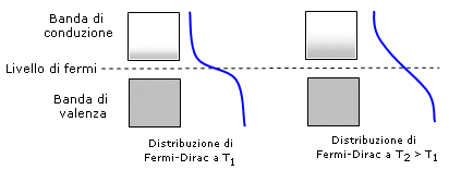 Ma a temperature superiori a zero kelvin gli elettroni, in quanto fermioni, obbedediscono alla distribuzione statistica di Fermi-Dirac. Anche per piccoli aumenti di temperatura, si rendono disponibili (nel senso statistico del termine) stati conduttivi, ossia elettroni che prima erano "congelati" nella metà inferiore della banda 2s, possono essere promossi ad energie più elevate e dunque risultano liberi di muoversi nel metallo e di condurre energia.