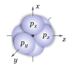 Prendiamo come modello per questa descrizione la molecola di N2, di cui abbiamo già rappresentato la formula di struttura secondo la teoria di Lewis. Sappiamo che la configurazione elettronica esterna dell'azoto è 2s22p3. Trascuriamo gli elettroni 2s (che ritroveremo nella molecola come coppia solitaria) e concentriamo la nostra attenzione sugli orbitali 2p, ciascuno dei quali contiene un elettrone spaiato. Ricordiamo che i tre O.A. 2p sono ortogonali fra loro, diretti lungo gli assi x, y, z, come mostrato nella figura a fianco e indichiamo come asse z, l'asse che unisce i due nuclei della molecola. |