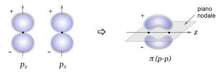 Anche i due orbitali 2px (e i 2py) possono comunque sovrapporsi, sia pur con modalità diversa, quando vengono a trovarsi in posizione parallela fra loro. Attraverso questa sovrapposizione laterale ha origine un nuovo orbitale di legame, detto orbitale π, diverso dall'orbitale σ (vedi figura).