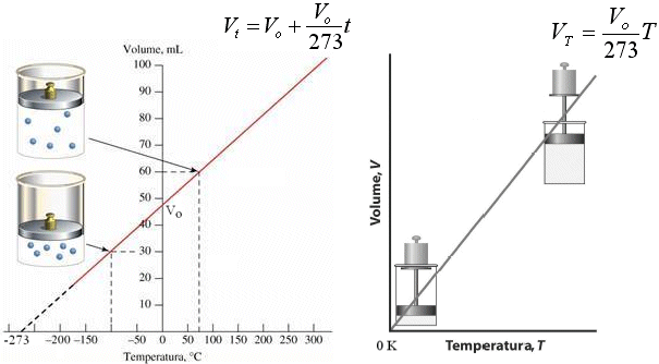 dove si osserva che il volume alla temperatura di t°C (Vt) è pari al volume alla temperatura di 0°C (Vo) aumentato di un valore pari a t/273 del volume Vo. Il volume a 0°C (Vo) varia di 1/273 per ogni variazione di 1°C. La relazione precedente può essere scritta
