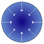 Fig.19.1 Schema che rappresenta la forza di coesione di una porzione di sostanza liquida, per cui essa tende, in assenza di altre forze, ad assumere forma sferica. Infatti le molecole interne risentono delle forze in tutte le direzioni; quelle superficiali invece soltanto verso l'interno. La superficie del liquido tenderà perciò a contrarsi in modo da essere minima, a parità di volume (la situazione ideale è perciò la sfera). |