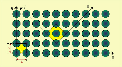 Fig.19.2 Schema bidimensionale di una struttura cristallina. Ogni cerchio rappresenta una unità strutturale che si ripete periodicamente e regolarmente lungo le varie direzioni. Se prendiamo gli assi x e y, l'unità ripetitiva avrà dimensioni a (lungo x) e b (lungo y), con un angolo di 90° fra i due assi. Possiamo così definire una cella elementare, di dimensioni a x b; è il minimo elemento di cristallo che contiene in sé tutti i caratteri (di simmetria) del cristallo stesso, e da cui, per ripetizione lungo gli assi, si può ricostruire il cristallo. Se si fossero scelti, per esempio, gli assi x' e y', si sarebbe individuata una diversa cella elementare; ma si cerca sempre la più piccola e più simmetrica: infatti la prima ha una sola unità entro la cella (1/4 di ogni cerchio), la seconda 2. |