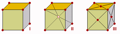 Fig.19.4 Esempi di celle elementari appartenenti al gruppo monometrico. Queste corrispondono solo a 3 dei 14 reticoli di Bravais che descrivono tutti i possibili reticoli dei gruppi e dei sistemi cristallografici. Tutte e tre queste celle hanno la forma di un cubo. Cella I, Cubica P (Primitiva): 1 sola unità in cella: 1/8 di ognuna delle 8 unità indicate in rosso appartiene alla cella. Cella II, Cubica I (Corpo-centrata): 2 unità in cella: 1/8 di ognuna delle 8 unità indicate in rosso + quella al centro, appartengono alla cella. Cella III, Cubica F (Facce-centrata): 4 unità in cella: 1/8 di ognuna delle 8 unità indicate in rosso + 1/2 di ognuna delle 6 al centro delle singole facce appartengono alla cella. |