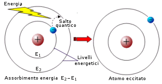 Un elettrone può passare da un livello più interno di energia Ei ad uno più esterno libero di energia Ee, solo se gli viene fornita esattamente la quantità di energia Ee-Ei. In altre parole se sono quantizzati i livelli energetici, allora sono quantizzate anche le differenze di energia tra i livelli (dislivelli energetici quantizzati). Ciò significa che ogni atomo può assorbire solo certe quantità di energia caratteristiche. Come abbiamo appena detto, quando un atomo assorbe energia un elettrone passa da un livello più interno ad uno più esterno (salto quantico o transizione elettronica) e l'atomo si viene a trovare in una situazione di instabilità (stato eccitato). Quando l'elettrone ritorna al livello energetico di partenza, viene restituita esattamente la medesima quantità di energia assorbita e l'atomo riacquista stabilità (stato fondamentale).