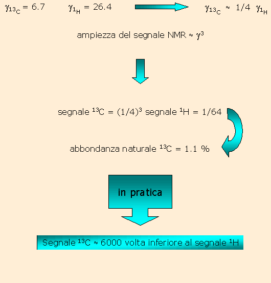 In termini pratici quindi è facile dedurre che per ottenere uno spettro di risonanza magnetica del carbonio sarà necessario ripetere la sequenza di impulso e acquisizione per un numero superiore di volte rispetto all'idrogeno. Durante l'acquisizione di uno spettro protone la sequenza viene ripetuta normalmente per 16 volte e i FID ottenuti vengono sommati, sottoposti a trasformata di Fourier e infine riportati in forma grafica. Nel caso del carbonio 16 acquisizioni non sono più sufficienti per ottenere un buon rapporto segnale rumore, i picchi cioè non sono più alti della linea di base. Tenendo conto che sperimentalmente l'ampiezza di un segnale NMR è proporzionale circa al cubo della costante giromagnetica la sensibilità dell'esperimento NMR applicato al 13C sarà:
