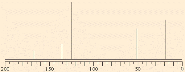 In figura 5 è riportato lo spettro del metacrilato di metile. Nella zona degli alifatici sono facilmente distinguibili i segnali relativi ai metili: a 18 ppm il segnale del metile legato al carbonio sp2 ed a 50 ppm il segnale più deschermato del metile legato all'eteroatomo. Nella zona dei carboni di tipo etilenico troviamo a 125 ppm il segnale del CH2= ed a 137 ppm il segnale del C=. Come nel caso dell'acetato di etile il segnale a frequenze più alte (167 ppm) va attribuito al C=O.