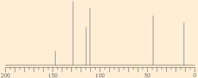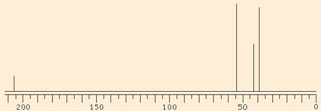 In figura 6 è riportato lo spettro dell'N-metil-piperidin-4-one che si differenzia da quelli precedenti per la presenza di carboni equivalenti. I due carboni metilenici adiacenti al gruppo carbonilico sono infatti identici e daranno origine ad un solo segnale così come i due gruppi metilenici adiacenti all'azoto. I carbonio più deschermato è ancora quello del gruppo C=O, mentre nella zona degli alifatici possiamo attribuire il segnale a 55 ppm ai metileni adiacenti all'azoto, mentre è più difficile distinguere i due segnali relativi ai metileni adiacenti al C=O e al metile su azoto. Anche se, come abbiamo già ricordato, non esiste proporzionalità diretta tra numero di atomi di carbonio ed ampiezza del segnale possiamo affermare che il segnale più intenso si riferisce ai due carboni metilenici mentre il meno intenso ad un solo carbonio, quello del metile.