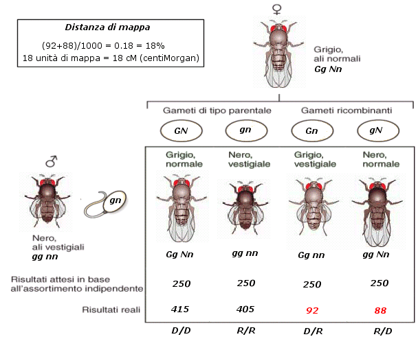 In uno dei suoi esperimenti Morgan incrociò una linea pura selvatica a Corpo grigio ed ali normali con una linea pura mutante a corpo nero ed ali atrofiche (o vestigiali). In F1 ottenne tutti ibridi a corpo grigio ed ali normali. Il colore grigio (allele G) è dominante sul colore nero (allele g) , le ali normali (allele N) sono dominanti sulle ali atrofiche (allele n).