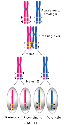 Morgan ipotizzò correttamente che i due caratteri fossero associati, ma che durante la meiosi avvenisse uno scambio fisico di materiale genetico tra le coppie di cromosomi omologhi, chiamato crossing-over (quando avviene, il crossing-over può essere osservato al microscopio, perché i cromosomi omologhi appaiati sono congiunti e assumono una struttura a X con formazione di chiasmi).