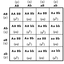 Ricordando inoltre che gli omozigoti recessivi (aa bb) sono gli unici individui che presentano un fenotipo differente da tutti gli altri e sono quindi facilmente individuabili, possiamo misurarne la frequenza p2. Estraendone poi la radice quadrata possiamo calcolare la frequenza p con cui si formano i gameti ab e AB. Ma poiché la somma di tutte le frequenze di formazione dei gameti deve dare l'unità (p + p + q + q = 2p + 2q = 1), possiamo calcolare la frequenza di ricombinazione 2q sottraendo 2p all'unità