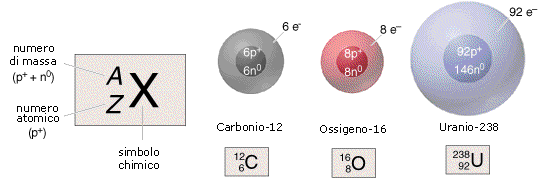 atomico Z in basso a sinistra del simbolo dell'elemento ed il numero di massa A (Z + N) in alto a