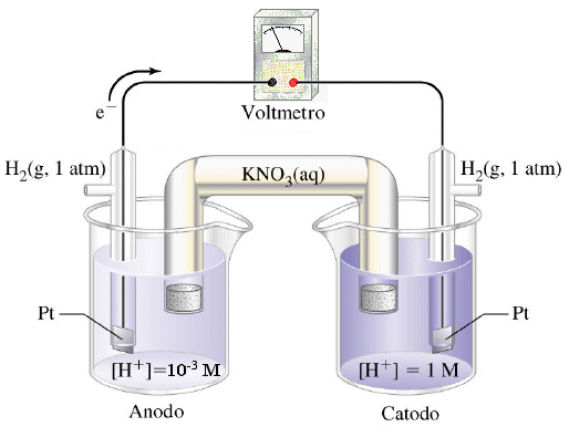 Nell'esempio appena visto, gli ioni H+ rappresentavano la specie ossidata della coppia redox H+/H2 e l'elettrodo più concentrato presenta il potenziale maggiore e funge da catodo.