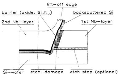 Possono sorgere seri problemi di omogeneità della barriera a causa dell'overetching nel substrato durante il passo iii., che porta ad una rideposizione del materiale del substrato sui lati esposti dell'isola (Fig. (3)).
