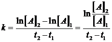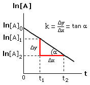 La costante di velocità specifica k può dunque essere calcolata conoscendo le concentrazioni a due tempi diversi. Il rapporto tra la differenza delle ordinate (Δy = ln[A]2 - ln[A]1) e la differenza delle ascisse (Δx = t2 - t1) di due punti fornisce infatti la pendenza della retta.