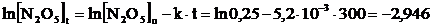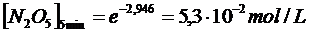 Sapendo che la reazione 2N2O5 → 4NO2 + O2 segue una cinetica di primo ordine e che la costante di velocità specifica a 65°C vale k = 5,2.10-3 s-1, calcoliamo la concentrazione di N2O5 dopo 5 minuti, sapendo che la sua concentrazione iniziale era di 0,25 mol/L