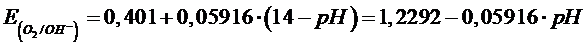 Il potenziale della prima semireazione è dato in condizioni standard e quindi per [OH-] = 1 M e dunque un pH = 14. La dipendenza di tale potenziale dal pH per 1 atm di pressione è