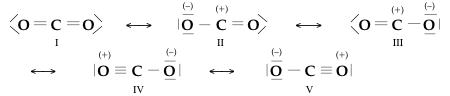Le strutture (IV) e (V), pur contenendo cariche separate piuttosto distanziate, conservano lo stesso numero di legami della (I) e danno un parziale contributo all'ibrido, come indica il valore sperimentale delle lunghezze di legame: entrambi 1.16 Å, contro 1.18 previsti per un doppio legame carbonio-ossigeno. Nell'anidride carbonica, il legame C-O ha pertanto parziale carattere di triplo legame. La molecola reale si può comunque considerare descritta in maniera soddisfacente dalla struttura (I).