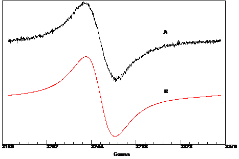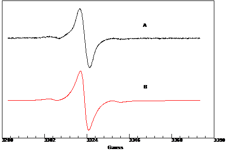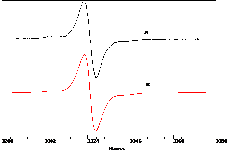 Figura 2. : Spettro EPR di CrCl2(THF)2(O,O'-C12H6N2O2) a T = 214 K in pirrolidone; A) sperimentale, B) simulato.