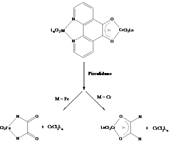 Un tentativo di spiegazione per queste osservazioni sperimentali fornite dalla tecnica EPR è riassunto nello schema 2.1. Sulla base di questi dati si può ipotizzare che i composti dinucleari sciolti in pirrolidone, subiscano una degradazione. In particolare si ipotizza che il derivato FeCl2(N,N'-C12H6N2O2-O,O')CrCl2(THF)2 si decomponga in un frammento contenente il ferro coordinato agli atomi di azoto diiminici, ed un altro contenente un addotto di cromo(II) con il pirrolidone (EPR silente). Anche il composto dinucleare CrCl2(THF)2(O,O'-C12H6N2O2-N,N')CrCl2(THF)2 si decompone in due frammenti contenenti cromo(III) coordinato al sito chinonico, ed cromo(II) coordinato alle molecole del solvente.