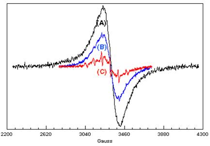 Figura 2. . Spettri EPR di VCp2(O,O'-C12H6N2O2) in NaCl a 294 K a diverse concentrazioni: (A) 5%, (B) 1%, (C) 0,25%