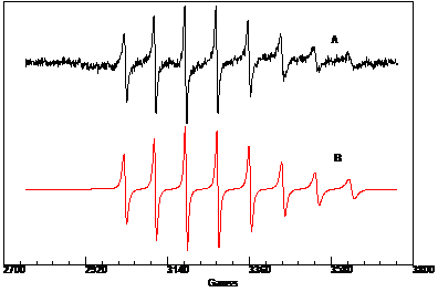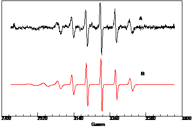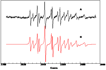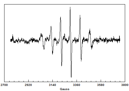 Per dimostrare l'effettiva presenza di otto righe nello spettro (due delle quali anticipate di debole intensità), abbiamo ritenuto essenziale dimostrare l'assenza del radicale sull'ossigeno che, avendo spin 5/2, fornirebbe uno spettro con sei righe. Ciò è stato possibile mediante l'esame delle costanti di accoppiamento dello spettro.