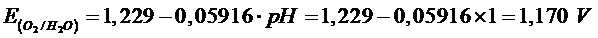 Ma per concentrazioni di ioni OH- molto piccole (pH ≤ 7) l'eventuale formazione di O2 appare difficilmente spiegabile in base alla sola scarica degli ioni OH- e si preferisce in tal caso considerare la semireazione di ossidazione dell'acqua, (equivalente a quella di ossidazione degli ioni OH-), la cui semireazione di riduzione ed il relativo potenziale sono