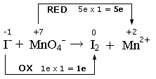 si scrivono i numeri di ossidazione e si individuano le semireazioni di ossidazione e di riduzione. Si calcola il numero di elettroni persi ed acquistati, come variazione del valore dei numeri di ossidazione (Δnox), moltiplicato per il numero di atomi (indice) dell'elemento che reagisce. Nell'esempio il Manganese diminuisce il suo nox (riduzione) da +7 a +2, con una variazione di 5 elettroni, mentre lo Iodio passa da -1 a 0 (ossidazione) con una variazione di 1 elettrone