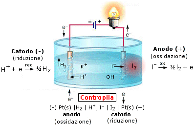 Si noti ancora come la contropila, pur conservando i segni (positivo e negativo) delle polarità, presenti l'anodo in corrispondenza del catodo della cella elettrolitica ed il catodo in corrispondenza dell'anodo.