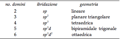 ibridazione e alla corrispondente geometria molecolare, utilizzando la tabella
