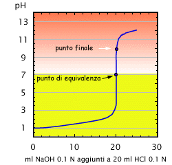 Supponiamo di avere all'inizio, in un becher, 20 ml di HCl 0.1 N, cui è stata aggiunta una goccia di una soluzione alcolica di rosso fenolo.