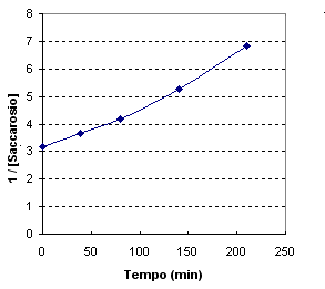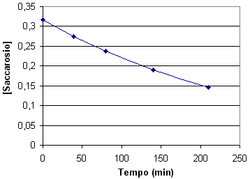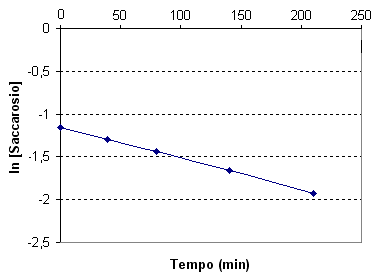 Nel secondo grafico (logaritmo della concentrazione contro tempo) i punti presentano un andamento lineare (si allineano lungo una retta) e dunque l'idrolisi del saccarosio presenta una cinetica del 1° ordine v = k [Saccarosio]
