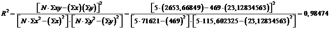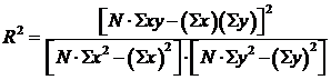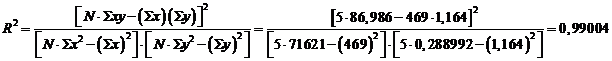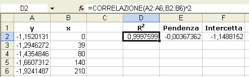 Nella cella D2 si è calcolato il coefficiente di determinazione, usando la funzione CORRELAZIONE(Matrice1;Matrice2) elevata al quadrato (^2). La funzione fornisce infatti il coefficiente di correlazione R. Per il calcolo è necessario sostituire a Matrice1 l'intervallo di celle corrispondenti ai valori della y ed a matrice2 l'intervallo di celle corrispondenti ai valori della x. Nella cella D2 è dunque contenuta la seguente istruzione