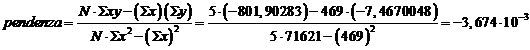 Nella cella E2 si è calcolato la Pendenza della retta usando la funzione PENDENZA(y_nota;x_nota). Nella cella E2 è dunque contenuta la seguente istruzione