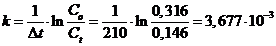 Per una stima più rapida, ma approssimata della costante cinetica è possibile calcolare la pendenza della retta che unisce il punto iniziale (t = 0; C = 0,316) al punto finale (t = 210 ; C = 0,146)
