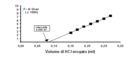 Per la determinazione si è utilizzato un titolatore automatico ABU91 Radiometer con software di gestione WALK che effettua automaticamente la regressione lineare tra le aggiunte di titolante ed i valori di F1 di Gran. Si ottiene così una retta che interseca l'asse del volume V0 al punto di equivalenza (Fig. 18).