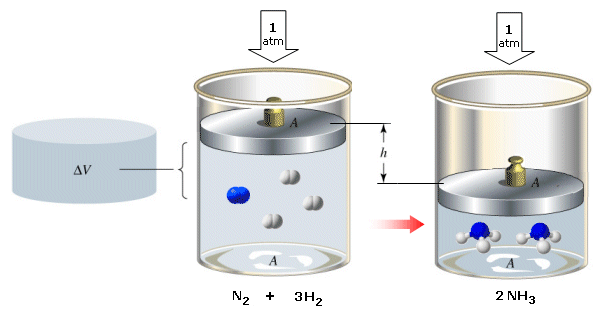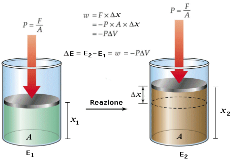 Se durante la reazione il numero complessivo delle moli gassose aumenta il sistema si espande utilizzando parte della sua energia interna per eseguire un lavoro, in genere contro l'atmosfera sovrastante. Il lavoro eseguito va a diminuire l'energia interna del sistema.