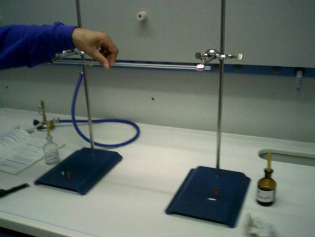 Cronometro, Basamenti con relative aste, 2 tappi, x quantità di HCl e di NH4OH, 2 pinzette, batuffoli di cotone e tubo di vetro trasparente di 50cm.