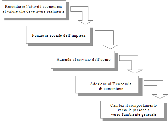 Anche dall'analisi svolta su alcune delle aziende che partecipano all'EdC, si rileva che l'adesione al progetto non si esaurisce , come detto, con il mettere in comune parte degli utili realizzati, ma si concretizza precipuamente attraverso un comportamento economico che si riflette sia all'interno dell'azienda, nell'organizzazione e nelle relazioni umane, sia all'esterno di essa nei rapporti con i clienti, con i fornitori e con la società. La diversità di questo comportamento economico sta nella motivazione suscitata dal desiderio di creare comunque nuovi posti di lavoro anche se poco produttivi, di soddisfare forti esigenze sociali, di mettere in primo piano gli interessi e le esigenze delle persone con cui si lavora o si viene in contatto. È un insieme di canoni che sembrerebbero rendere ancora più difficile il successo economico, ma che invece, dai dati desumibili dalle prime realizzazioni, si rivelano capaci di innescare una grande creatività collettiva di datori di lavoro e lavoratori, uno degli elementi più preziosi nel mondo produttivo di oggi, in cui non mancano certo le risorse finanziarie per nuove imprese economiche, quanto forse delle valide idee produttive.[284]