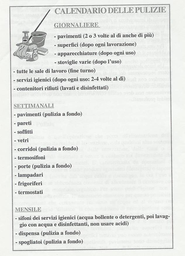 settimanali: pavimenti ( a fondo), pareti, soffitti, vetri, corridoi, termosifoni, porte a fondo, lampadari, frigoriferi,