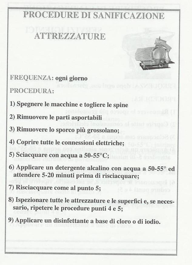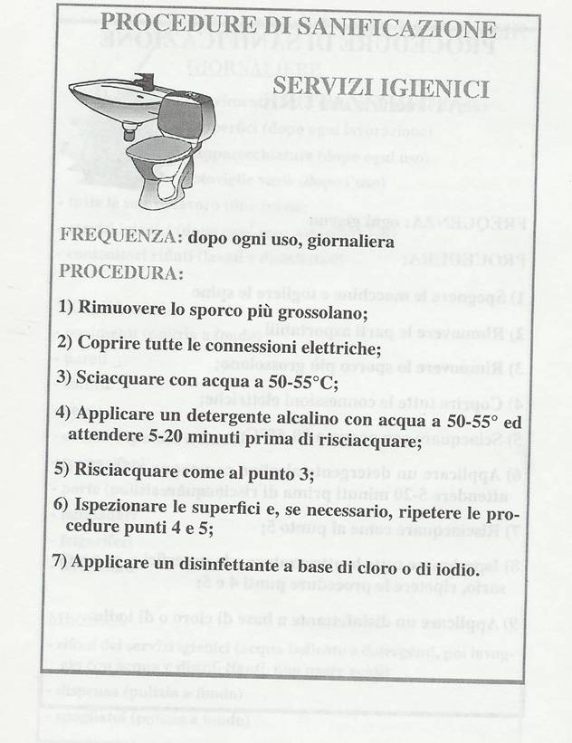 giornaliere: pavimenti, superficie di lavorazione, apparecchiature, stoviglie, sale di lavoro, servizi igienici, contenitori rifiuti