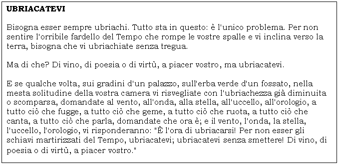 Ma di che? Di vino, di poesia o di virtù, a piacer vostro, ma ubriacatevi."